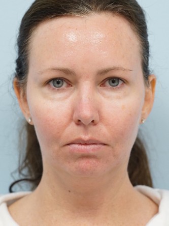 Case ID: 1053Radiesse or calcium hydroxyapatite is injected to lift and volumize her midface, and to enhance the “Ogee” curve on oblique view and fill the laugh lines on frontal view. She appears much more aesthetically gratifying.